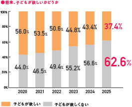 ●若年未婚男女において、「将来、子どもが欲しいかどうか」に対して、欲しい37.4%、欲しくない62.6%と回答しており、「現在、そして将来も子どもを欲しいと思わない」の回答において、2018年の調査以降、初めて女性(64.7%)の割合が男性(60.7%)の割合を上回りました。