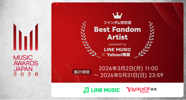 LINE MUSIC株式会社(以下、LINE MUSIC)は、一般社団法人カルチャー アンド エンタテインメント産業振興会(以下、CEIPA)が主催する国内最大規模の国際音楽賞「MUSIC AWARDS JAPAN」のプライズパートナーとして参加し、新たに創設したファンダム特別賞「Best Fandom Artist powered by LINE MUSIC & Yahoo!検索」において、2026年3月2日(月)より、LINE MUSICならびにYahoo!検索にて集計を開始しました。