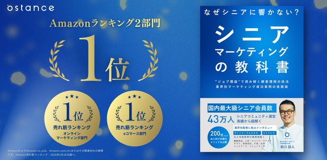 国内最大級(会員数43万人※)のシニア向けコミュニティサービス『趣味人倶楽部』(しゅみーとくらぶ)を運営し、シニアDXを推進する株式会社オースタンス(本社:東京都品川区、代表取締役社長:菊川諒人)は、これまでに200社以上のシニア事業を支援してきた知見を体系化したまとめ、2/19(木)よりAmazon Kindleにて販売を開始しました、書籍『シニアマーケティングの教科書』が、この度、Amazon.co.jpのランキングにおいて2部門で1位を獲得したことをお知らせいたします。(2026年2月26日当社調べ)