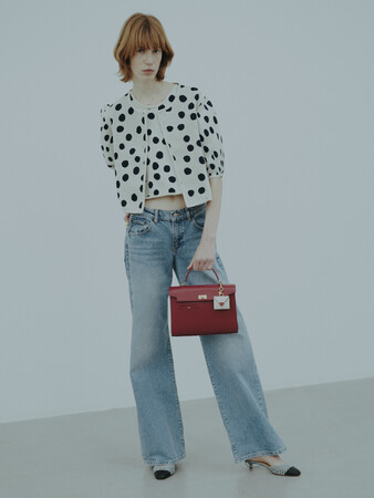 ポルカドットのトップスに、赤いバッグを加えるだけで、気負わない日常のデニムスタイルが、カフェからディナーまで寄り添う一着へと変わります。ミニマルな美しさと、女性の体をきれいに見せるラインを両立させたデザインのデニムは、ワードローブの軸として長く愛用したくなる存在です。