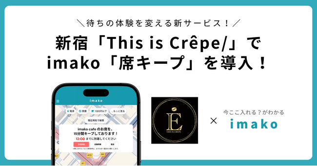 株式会示imako(本社:東京都渋谷区、代表取締役:浜田真衣)が運営するカフェ混雑情報マップ「imako(いまこ)」は、新宿御苑のフレンチクレープ専門店「This is Crepe」(東京都新宿区新宿)において、マップ上から気になるカフェの空き状況をお店に確認できるサービス「直前席キープ」の導入を開始したことをお知らせいたします。