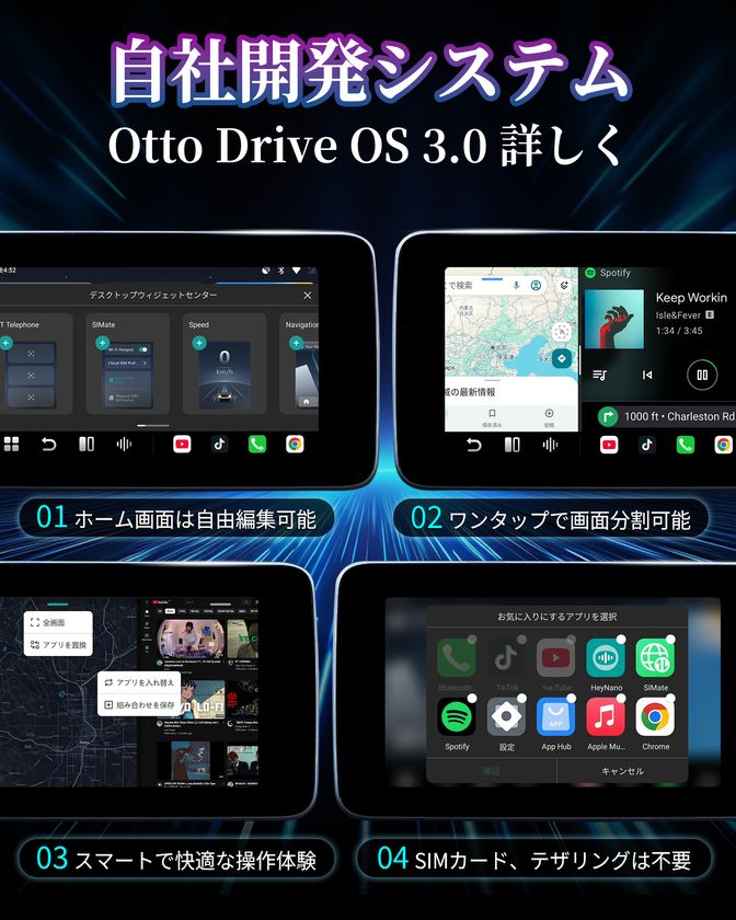 自社開発の「OttoDrive 3.0 OS」を搭載し、システム全体の安定性と操作性が大幅に向上。レスポンスの改善はもちろん、レイアウトや表示内容のカスタマイズにも柔軟に対応し、ユーザーの好みに合わせたインターフェース設定が可能です。