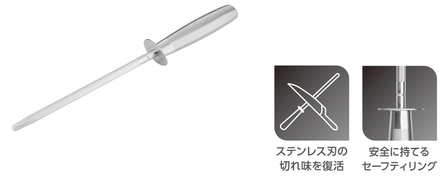 「ロッド シャープナー」は、ロッド(棒)部分に施された細かな溝にキッチンナイフ(包丁)の刃をこするようにすべらせ、丸くなった刃を整えることで切れ味を回復させるシャープナーです。