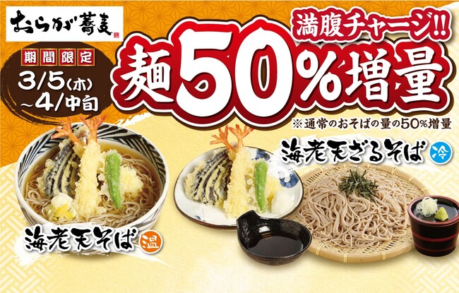 グルメ杵屋グループの株式会社グルメ杵屋レストラン(大阪市住之江区北加賀屋三丁目4番7号、代表取締役社長:吉田 正敏)が運営する「おらが蕎麦」では、2026年3月5日(木)より期間限定で「満腹チャージ!! 麺50%増量」キャンペーンを実施いたします。