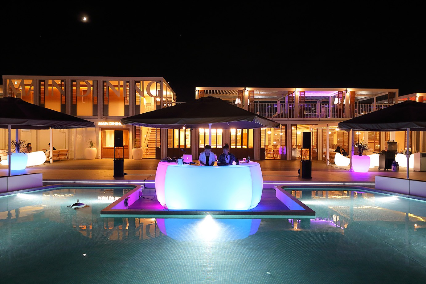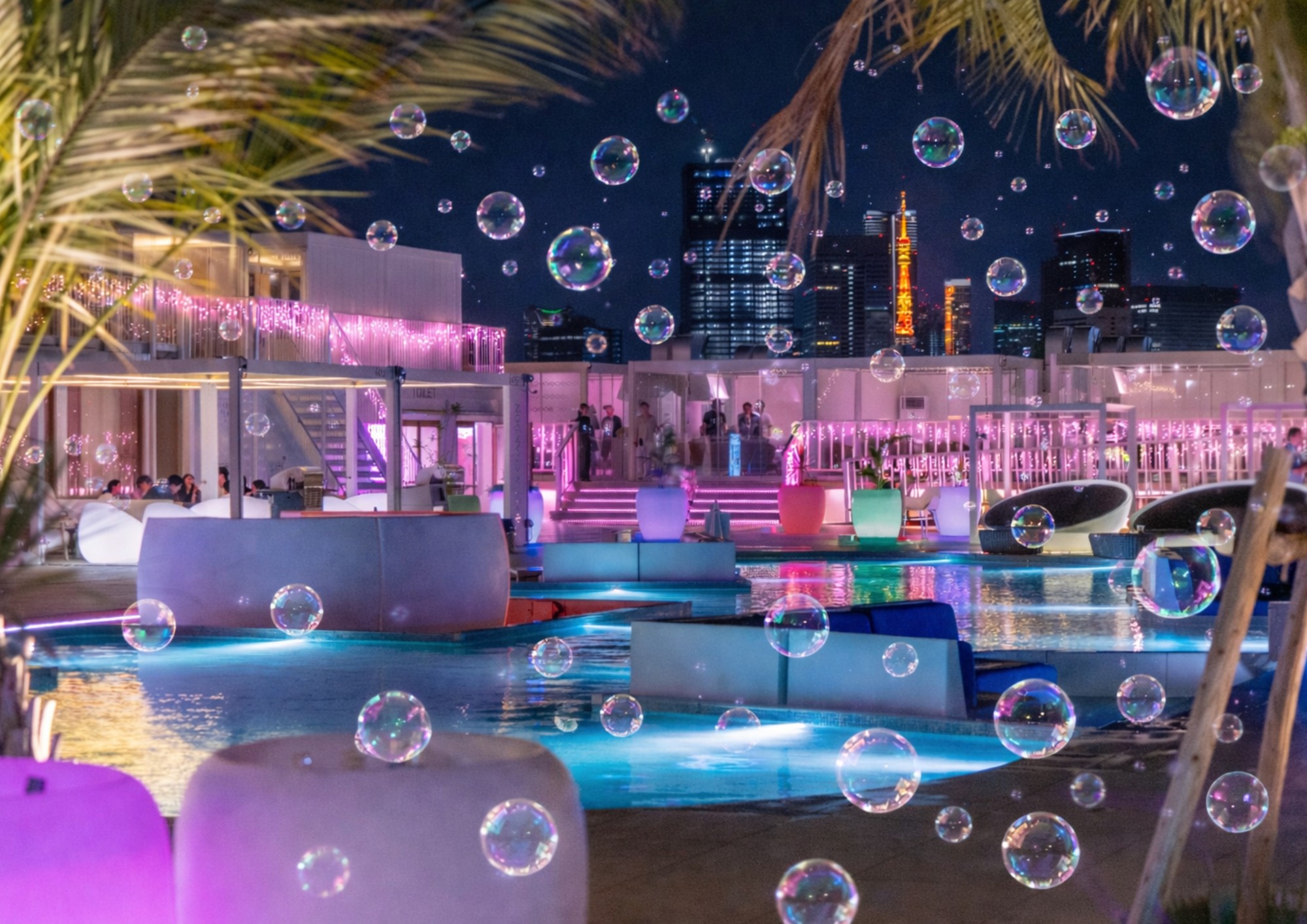 昼は通常のシャボン玉体験、夜はピンクのシャボン玉ショーを実施。キラナの空にシャボン玉を解き放ちます。