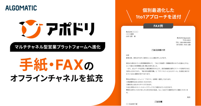 株式会社Algomatic(本社:東京都港区、代表取締役:大野峻典、以下Algomatic)が開発・提供す営業AIエージェント『アポドリ』は、2026年3月3日、オフラインチャネルでのアプローチプランを新たに追加したことをお知らせいたします。これにより、FAXおよび手紙を活用した1to1アプローチが可能となり、オンラインとオフラインを横断するラストワンマイルの営業ソリューションを実現し、マルチチャネル型営業プラットフォームへと進化します。