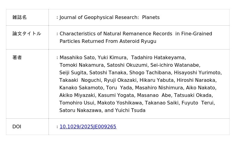 東京理科大学 理学部第一部 物理学科の佐藤 雅彦准教授、北海道大学の木村 勇気教授、岡山理科大学の畠山 唯達教授、東北大学の中村 智樹教授、名古屋大学の渡邊 誠一郎教授を中心とする共同研究グループは、小惑星探査機「はやぶさ2」によって地球へ持ち帰られた小惑星リュウグウの微小試料に対して高感度な磁気測定を行い、太陽系形成初期における磁場環境に関する新たな知見を得ました。本研究では、研究グループが開発した高感度SQUID磁力計を用いた微小試料測定技術により、サブミリメートルサイズのリュウグウ試料約30個を系統的に分析することに成功しました。その結果、これまで研究グループごとに異なっていた解釈を統合的に理解するための十分な磁気データが得られ、リュウグウ母天体が太陽系形成後およそ300万~700万年に経験した水質変成時の外部磁場環境を記録している可能性が強く示唆されました。本成果は、太陽系初期の物質進化や惑星形成環境を理解する上で重要な手がかりを与えるものです。