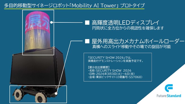 映像解析AIソリューションを提供する株式会社フューチャースタンダード(本社:東京都台東区、代表取締役:岡 寛)は、2026年3月3日から東京ビッグサイトで開催される「SECURITY SHOW 2026」において、工事現場の安全確保や商業施設・イベント会場での情報発信、省人化を実現する、多目的移動型サイネージロボット「Mobility AI Tower(モビリティ・エーアイ・タワー)」のプロトタイプを初公開いたします。