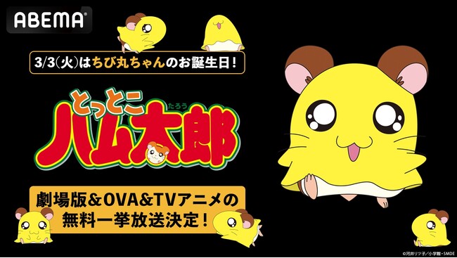 新しい未来のテレビ「ABEMA」は、平成を代表する大人気アニメ『とっとこハム太郎』より、ハムちゃんずの末っ子・ちび丸ちゃんの誕生日を記念し、誕生日当日の2026年3月3日(火)昼12時より、『とっとこハム太郎』劇場版およびOVAの無料一挙放送を実施いたします。