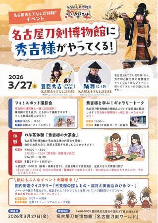 名古屋刀剣博物館では、2026年3月27日(金)、名古屋おもてなし武将隊(R)から豊臣秀吉様と踊舞様を迎えて1日限定イベントを開催します。フォトスポットでの撮影会や、お抹茶体験ができるワークショップ、秀吉様と学ぶギャラリートークなど、秀吉様・踊舞様と楽しめるイベントが盛りだくさん!ぜひお越しください!
