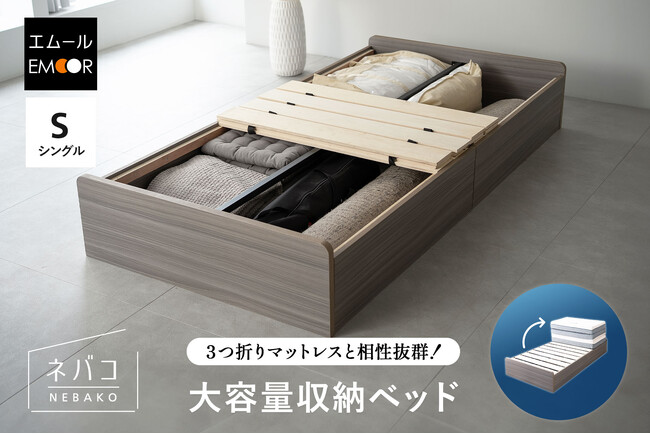 "収納が足りない"をベッドで解決!クローゼット級の超大容量収納を備えたベッド『ネバコ -NABAKO-』が新登場!人気の三つ折りマットレスと相性抜群のベッドフレームで新生活の睡眠と収納をアップデート!