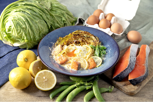 ▲半熟に仕上げた北坂たまごと鮭と島キャベツのレモンクリーム 税込1760円