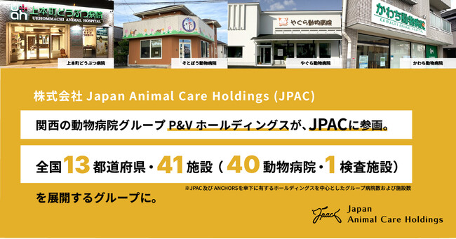 株式会社Japan Animal Care Holdings(以下、JPAC)は、動物病院グループであるP&Vホールディングス株式会社(以下、P&V)がJPACグループに参画したことをお知らせいたします。