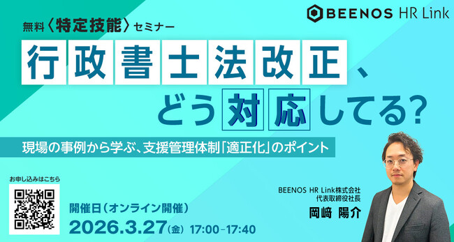 BEENOS株式会社の連結子会社で、特定技能雇用を包括支援するBEENOS HR Link株式会社(以下「BEENOS HR Link」)は、2026年3月27日(金)に、無料オンラインセミナー「行政書士法改正、結局どう対応してる?現場の事例から学ぶ、支援管理体制「適正化」のポイント」を開催いたします。