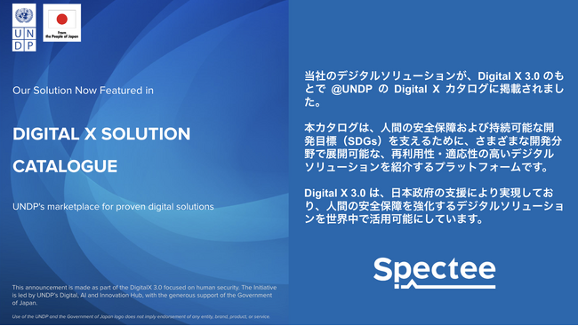 レジリエンス・テック・スタートアップの株式会社Spectee(本社:東京都千代田区、代表取締役:村上建治郎、以下「Spectee」)は、当社のAIリアルタイム防災・危機管理サービス『Spectee Pro』が、国連開発計画(UNDP)のDigital X 3.0プロジェクトのもと、「Digital X カタログ」に掲載されたことをお知らせします。