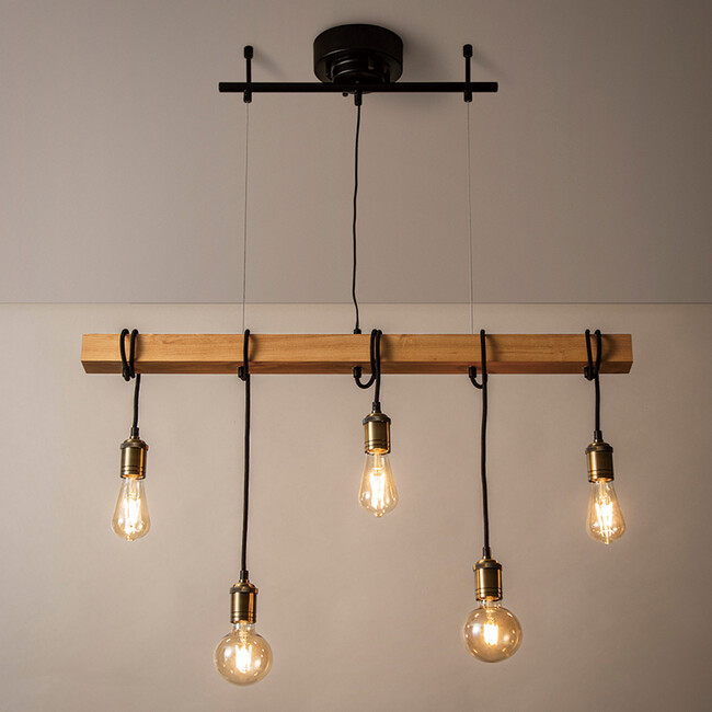 ウッドバーに5つの電球ソケットを吊り下げた個性的なデザイン。ウッドバーの質感と電球のあたたかなあかりが、ぬくもりのある空間を演出します。ウッドバーにコードを巻いて電球の高さを調整することで、電球の高さに変化を出して楽しむことができます。遊び心あふれるペンダントライトです。