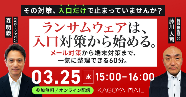 カゴヤ・ジャパン株式会社(本社:京都市、以下カゴヤ・ジャパン)と、情報技術開発株式会社(以下tdi)は、ランサムウェアや標的型攻撃への対策をテーマとしたオンラインセミナー「ランサムウェアは“入口×端末”で止める ~情シス専任じゃなくてもできるメール×エンドポイント多層防御~」を、2026年3月25日(水)に共催で開催いたします。