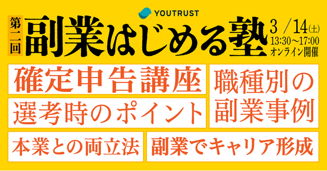 【参加無料】YOUTRUST「副業はじめる塾」に、僕と私と株式会社・今瀧健登が登壇決定!3月14日(土)オンライン開催