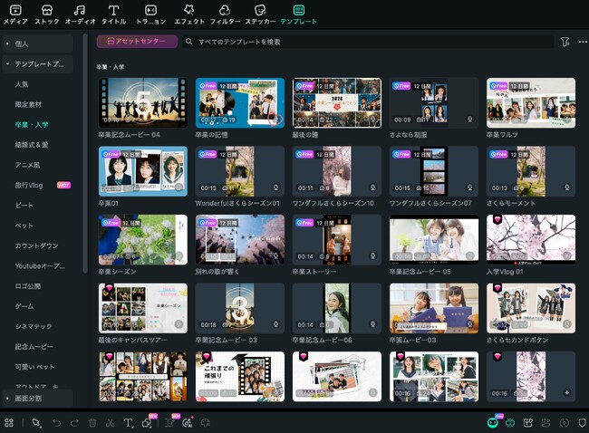 期間中は「卒業AIテンプレート」および「卒業アセット」を3月16日まで期間限定で無料開放。初めて動画編集に挑戦する方でも、思い出スライドショーやVlogなど、さまざまなスタイルで気軽に作品をご制作いただけます。