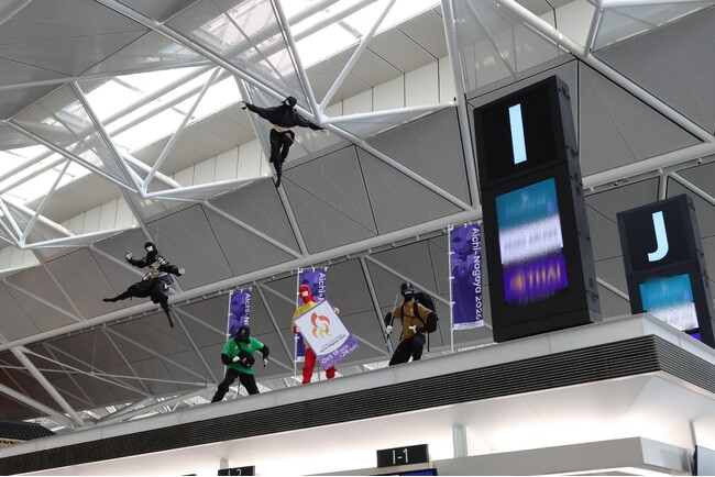 空港館内には忍者が潜んでおり、アジアパラ競技大会に向けて、忍者たちが大会ボランティア装束を身にまとい、みなさまをお出迎えしています。