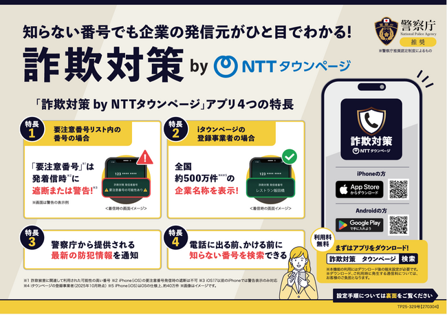 こうした状況を受け、本アプリは、詐欺被害の入口となりやすい電話の着信時点で、警察庁やトビラシステムズが把握する詐欺関連番号情報による遮断・警告に加え、実在性を確認済みの事業者情報を集約した「iタウンページデータベース」を発着信時の名称表示(ホワイトリスト)として活用することで、電話に出る前に「安心して応答できるかどうか」を判断しやすい環境を提供します。