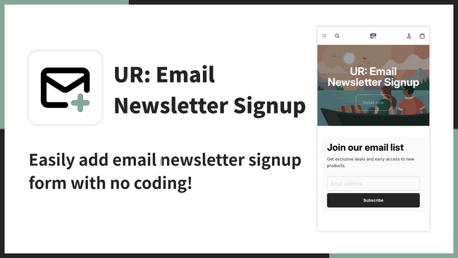 UR: Email Newsletter Signup は、ホーム・コレクション・商品ページなど任意のページに、デザイン性の高いメルマガ登録フォームを追加できるノーコードアプリです。