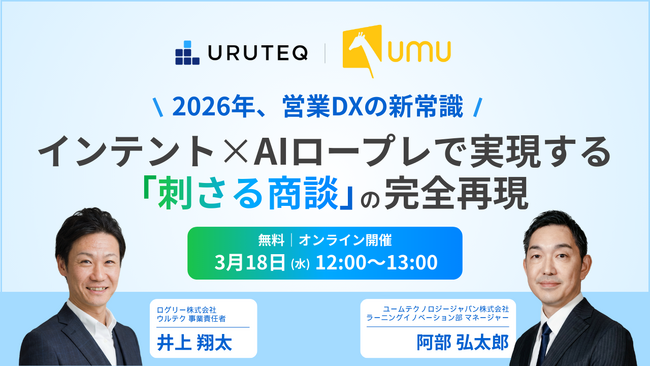 BtoBマーケティングエージェント『ウルテク( https://uruteq.logly.co.jp/ )』を提供するログリー株式会社(本社:東京都渋谷区、代表取締役:吉永浩和、証券コード:6579、以下、ログリー)と、AIを活用した学習プラットフォームを提供するユームテクノロジージャパン株式会社(本社:東京都新宿区、代表取締役:松田 しゅう平、以下、ユームテクノロジージャパン)は、2026年3月18日(水)に「2026年、営業DXの新常識:インテント×AIロープレで実現する『刺さる商談』の完全再現」をテーマとした無料オンラインウェビナーを共催いたします。