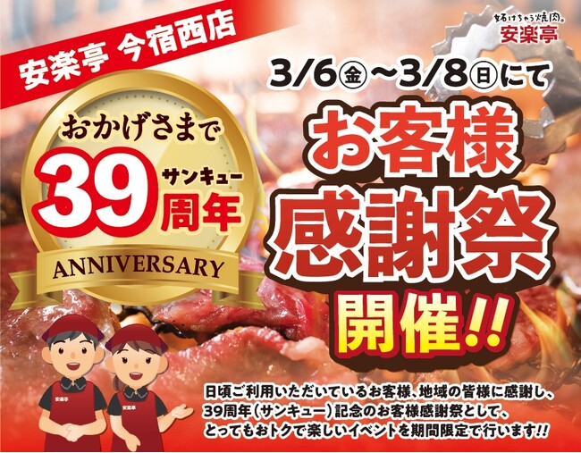 安楽亭今宿西店にて、39(サンキュー)周年としてお客様感謝祭を開催いたします!!(2026年3月6日(金)~2026年3月8日(日))
