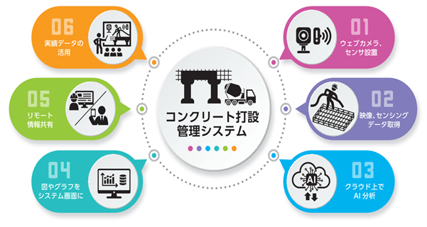 本システムは、熟練監督社員の減少や若年社員の経験不足による品質トラブルを未然に防ぐことを目的に開発されました。現場に設置したWEBカメラや各種センサにより作業状況を記録し、クラウド上の管理システムにて取得データのAI分析を実施。分析結果はグラフや図で可視化され、インターネット環境によりPCやタブレットなどのデバイスを通じてリアルタイムに確認できます。これにより、現場に加えて遠隔地からの支援が可能となり、打設の進行に応じた作業指示の精度向上や品質トラブルの未然防止につながります。[画像1: https://prcdn.freetls.fastly.net/release_image/141073/41/141073-41-d5f78856a828d5ad96884de8f50f1da1-601x320.png?width=536&quality=85%2C75&format=jpeg&auto=webp&fit=bounds&bg-color=fff ]