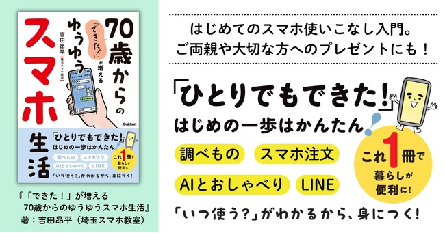 [画像6: https://prcdn.freetls.fastly.net/release_image/2535/8724/2535-8724-726e4965b14ff6b43b2a93fb40d505c2-845x1200.jpg?width=536&quality=85%2C75&format=jpeg&auto=webp&fit=bounds&bg-color=fff ]『「できた!」が増える 70歳からのゆうゆうスマホ生活』