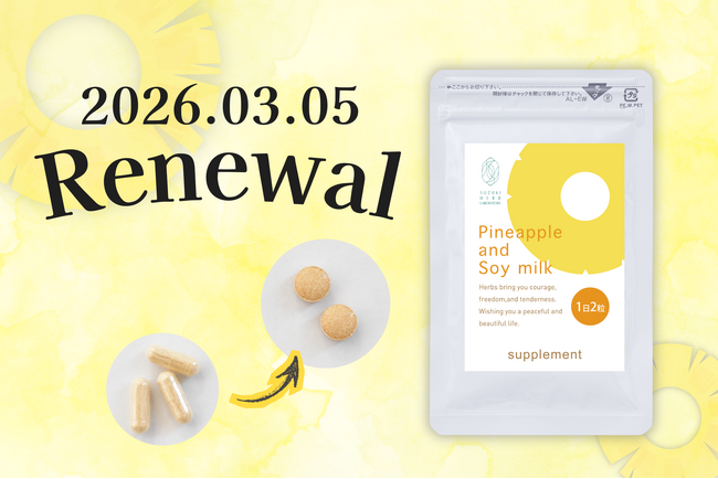 株式会社鈴木ハーブ研究所は、体毛ケア*1ができる「パイナップル豆乳シリーズ」から、《パイナップル豆乳サプリ》を2026年3月5日(木)よりリニューアル新発売いたします。《パイナップル豆乳サプリ》は、パイナップル豆乳ローションに配合している大豆イソフラボンをインナーケアとしてチャージできるサプリメントです。合成着色料、合成香料、防腐剤フリー。