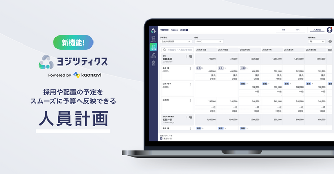 株式会社カオナビ(本社:東京都渋谷区、代表取締役社長CEO:佐藤 寛之)が提供する予実管理システム「ヨジツティクス」は、「人員計画」機能を2026年3月5日(木)に提供開始します。本機能により、これまで別々に管理され把握に時間がかかっていた人員計画と予算を連携させ、現場の実態に即した精度の高い人件費の予算・実績管理を実現します。