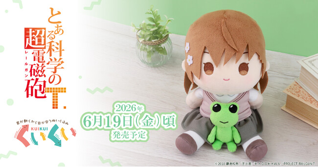 御坂美琴がゲコ太といっしょに「くいくい」になって登場!「くいくい」とは、首がくいっと曲がるお座りぬいぐるみ。あなたを優しく見上げます。目が合いやすい角度でデスクの上に置いたり、お出かけ先でポーズをとって撮影したり…自由で癒しの時間をお届けします。