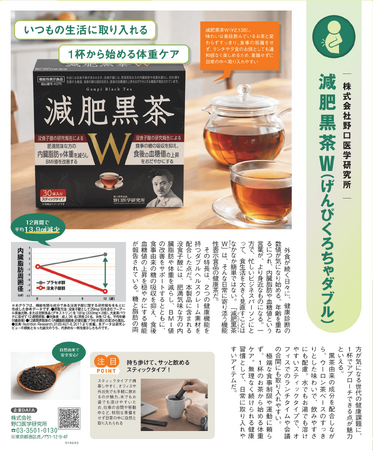 株式会社野口医学研究所(本社:東京都港区)は、機能性表示食品「減肥黒茶W(げんぴくろちゃダブル)」について、2026年3月4日発売の「日経トレンディ」に広告を掲載いたしました。
