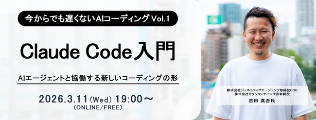 株式会社MCEAホールディングス(東京都港区/代表取締役社長 齋藤 武育)のグループ会社で、 ITエンジニアの新しい働き方を提案する株式会社PE-BANK(東京都港区/代表取締役社長 高田 幹也)は、2026年3月11日(水)19時より、ウェビナー『今からでも遅くないAIコーディングVol.1~ Claude Code入門 ~AIエージェントと協働する新しいコーディングの形~ 』を開催します。本セミナーは、株式会社PE-BANKが運営するITフリーランス向け福利厚生サービス「サポートプラス」が主催しており、今回で74回目の開催となります。今回は、オンライン形式での開催となります。