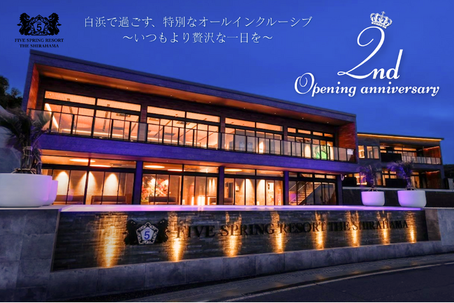 株式会社永晃(所在地:大阪市中央区/代表取締役:張 智恵)が運営する和歌山県白浜町に開業したオールインクルーシブ型リゾートホテル「FIVE SPRING RESORT THE SHIRAHAMA(以下、当ホテル)」は、2026年3月で開業2周年を迎えるにあたり、通常料金より宿泊料20%割引を含む、各種特典が付いた特別プランを2026年4月30日(木)までの期間限定で開始しました。
