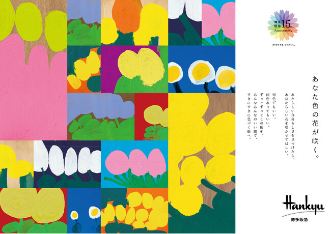 博多阪急15周年のストアメッセージは「FUN BLOOM(楽しさが、街を咲かせる)」。ヘラルボニー契約作家・福井将宏氏の作品を“視点を変えるレンズ”とし、いつもの景色が輝く「発見」と「彩り」をお届けいたします。
