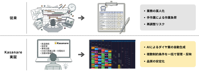 こうした背景から、多くの条件を踏まえた運行ダイヤの作成業務において、生成AIソフトウェア「Kasanare」を用いたAIエージェントの有効性についての検証を開始しました。