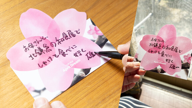桜のハガキに手書きで夢を書き、同梱された封筒に入れ、ポストに投函することで、好きな宛先に夢をお届けすることが出来ます。