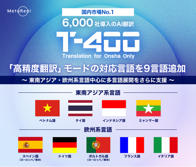 株式会社メタリアルグループで、国内市場No.1※1のAI翻訳サービスを開発・提供する株式会社ロゼッタ(代表取締役:五石 順一)は、2026年3月5日、高精度産業翻訳AI「T-4OO(ティーフォーオーオー)」において、「高精度翻訳」モードの対応言語を9言語追加したことをお知らせします※2。