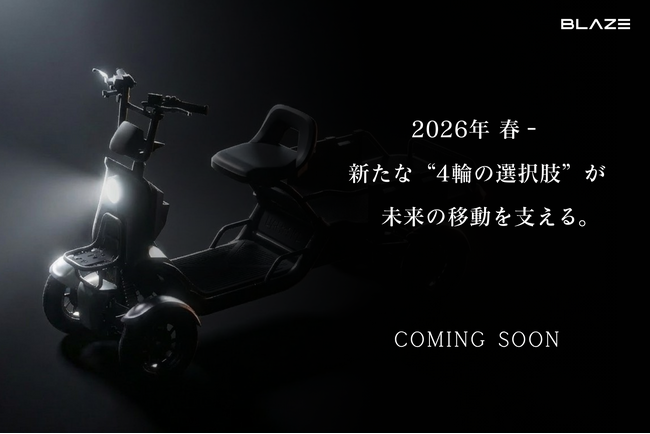 株式会社ブレイズ(愛知県名古屋市、代表取締役:市川秀幸、以下ブレイズ)は、2026年春ごろに、当社の特定小型原動機付自転車(以下、特定小型原付)としては、初の4輪モデルとなる新商品の発表を予定しております。