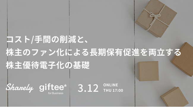 【Sharely/ギフティ共催】株主優待電子化の実務ノウハウを提供するウェビナー「コスト/手間の削減と、株主のファン化による長期保有促進を両立する株主優待電子化の基礎」を3/12(木)に開催