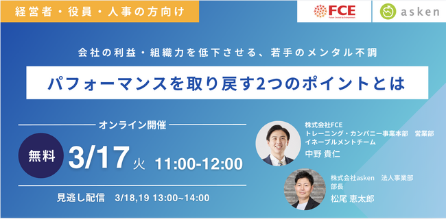 累計会員数1,300万人超・国内No.1*¹のAI食事管理アプリ『あすけん』を開発・運営する株式会社asken(東京都新宿区、代表取締役社長 中島洋、以下「当社」)は、DX推進事業・教育研修事業・出版事業を展開する株式会社FCE(東京都新宿区、代表取締役社長:石川淳悦、以下「FCE」)と、経営者・人事向けの無料ウェビナー「会社の利益・組織力を低下させる、若手のメンタル不調 パフォーマンスを取り戻す2つのポイントとは(以下「本ウェビナー」)」を2026年3月17日(火)11:00~12:00に開催いたします。