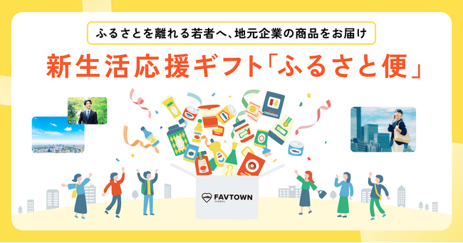 「ふるさと便」は、FAVTOWNが自治体および地元企業などと連携し、特産品や日用品などを詰め合わせた新生活応援ギフトを無料で届ける施策です。進学や就職を機に地元を離れた18~29歳の若者へ、