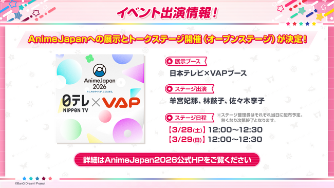 [画像: https://prcdn.freetls.fastly.net/release_image/14827/9337/14827-9337-56f278051cce231ef35769dca9c5eb94-1920x1080.png?width=536&quality=85%2C75&format=jpeg&auto=webp&fit=bounds&bg-color=fff ]2026年3月28日(土)から29日(日)にかけて東京ビッグサイトにて開催される、AnimeJapan 2026 日本テレビ×VAPブースにて、「BanG Dream! It's MyGO!!!!!/Ave Mujica」続編TVアニメの出展とトークステージの開催が決定いたしましたことをお知らせいたします。