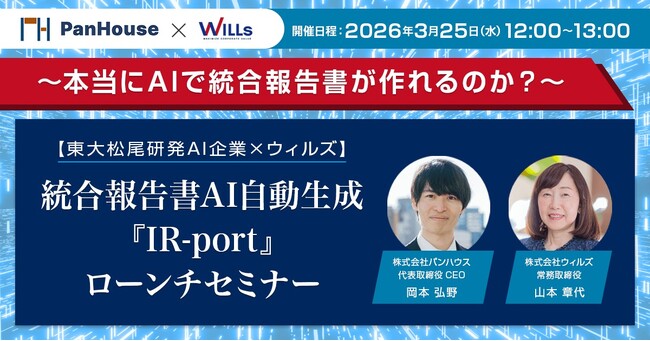 投資家と上場企業を結ぶIR支援カンパニーである株式会社ウィルズ(本社:東京都港区、代表取締役社長:杉本 光生)は2026年3月25日 (水)に【東大松尾研発AI企業×ウィルズ】統合報告書AI自動生成