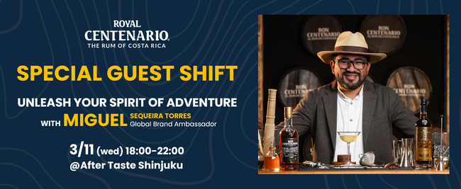 株式会社 都光(東京都台東区)が日本国内正規代理店として販売するコスタリカ産プレミアムラム「ロイヤル・センテナリオ」。この度、グローバルブランドアンバサダーを務めるミゲル・セケイラ・トーレス氏が来日し、ゲストバーテンディングイベントを2026年3月11日(水)東京・新宿のダイニングバー「After Taste」にて開催します。