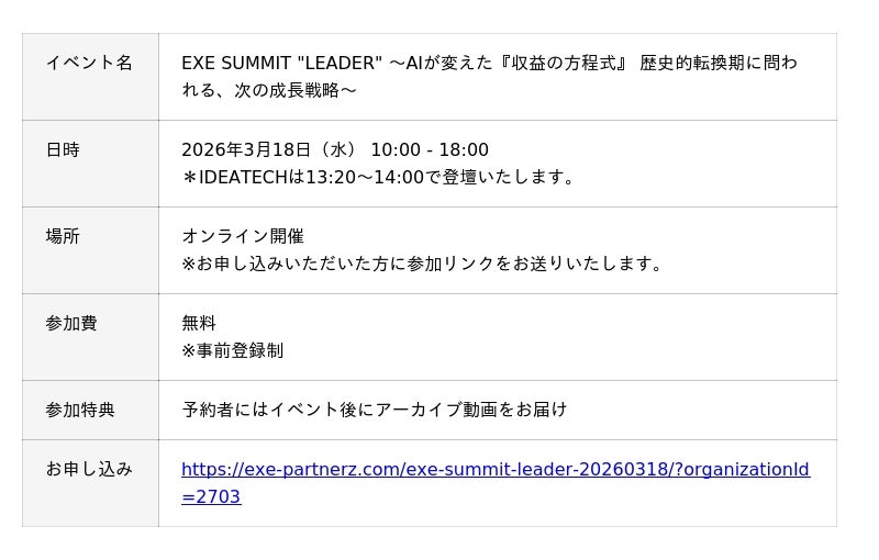 【3月18日 開催|AIが変えた『収益の方程式』 歴史的転換期に問われる、次の成長戦略】IDEATECH、「EXE SUMMIT "LEADER" 」に登壇