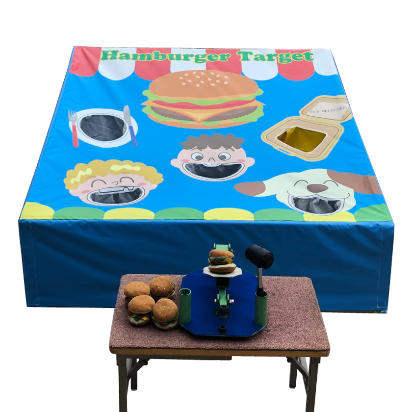 ・バーガーターゲット:叩き台にハンバーガーをのせて、ハンマーで思いっきり叩きハンバーガーを飛ばします。ハンバーガーを上手く食べさせられたら成功です。