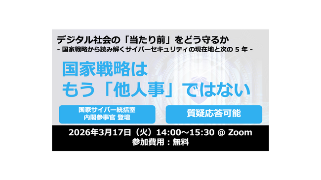 一般社団法人サイバーセキュリティ連盟(以下、連盟)の運営会員企業であるかっこ株式会社(本社:東京都港区、代表取締役社長 : 岩井 裕之、証券コード:4166、以下 Cacco)は、2026年3月17日(火)に、「デジタル社会の『当たり前』をどう守るか -国家戦略から読み解くサイバーセキュリティの現在地と次の 5 年-」と題したオンラインセミナーを開催いたします。